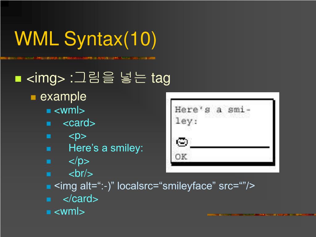 WML Syntax(10) • <img> :그림을 넣는 tag • example • <wml> • <card> • <p> • Here’s a smiley: • </p> • <br/> • <img alt=“:-)” localsrc=“smileyface” src=“”/> • </card> • <wml>