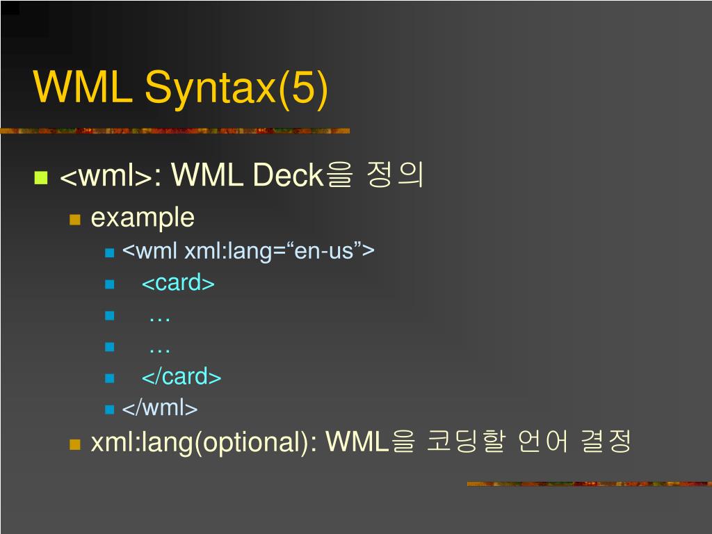 WML Syntax(5) • <wml>: WML Deck을 정의 • example • <wml xml:lang=“en-us”> • <card> • … • … • </card> • </wml> • xml:lang(optional): WML을 코딩할 언어 결정