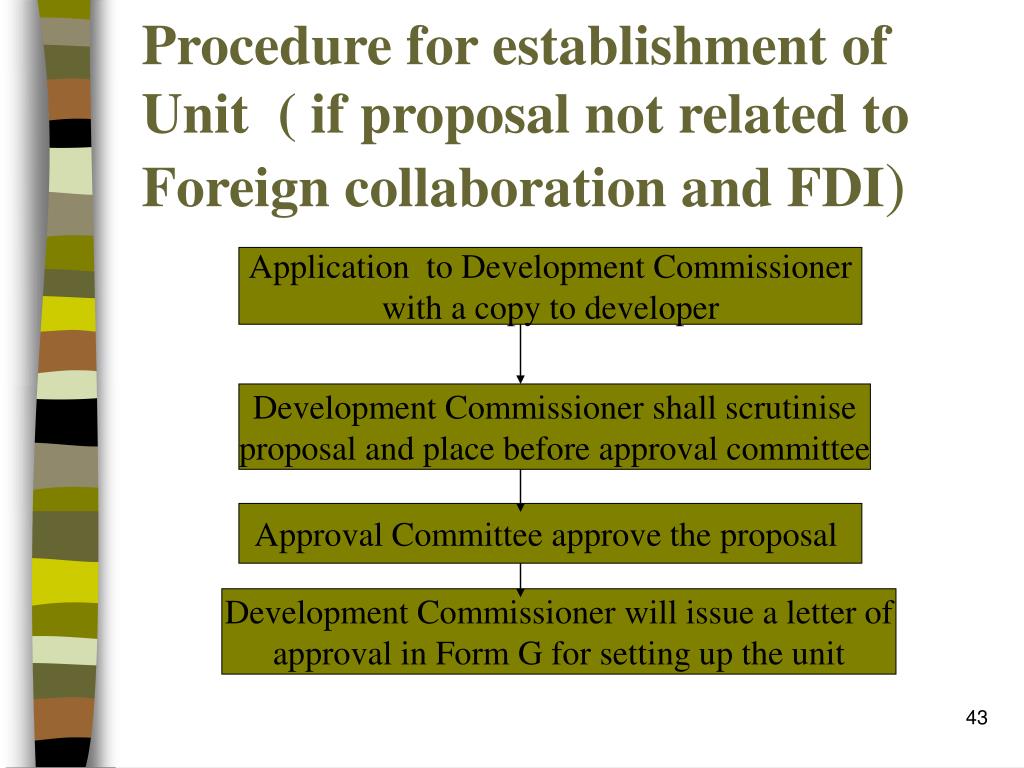 Procedure for establishment of Unit ( if proposal relates to Foreign collaboration and FDI) Application to Development Commissioner with a copy to developer Development Commissioner shall scrutinise proposal and place before Board Board shall approve the proposal Development Commissioner will issue a letter of approval in Form G for setting up the unit
