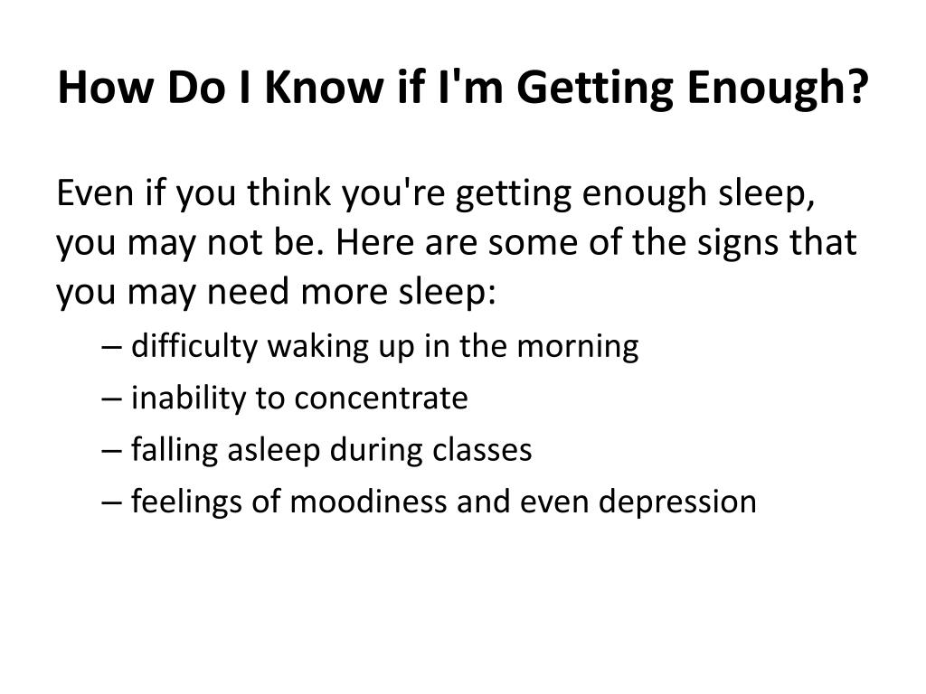 How Do I Know if I'm Getting Enough? Even if you think you're getting enough sleep, you may not be. Here are some of the signs that you may need more sleep: • difficulty waking up in the morning • inability to concentrate • falling asleep during classes • feelings of moodiness and even depression