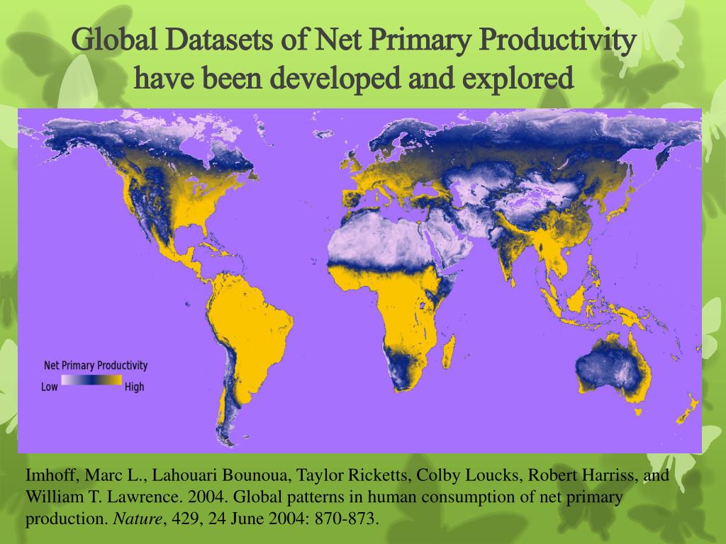 Global Datasets of Net Primary Productivity have been developed and explored Imhoff, Marc L., Lahouari Bounoua, Taylor Ricketts, Colby Loucks, Robert Harriss, and William T. Lawrence. 2004. Global patterns in human consumption of net primary production. Nature, 429, 24 June 2004: 870-873.
