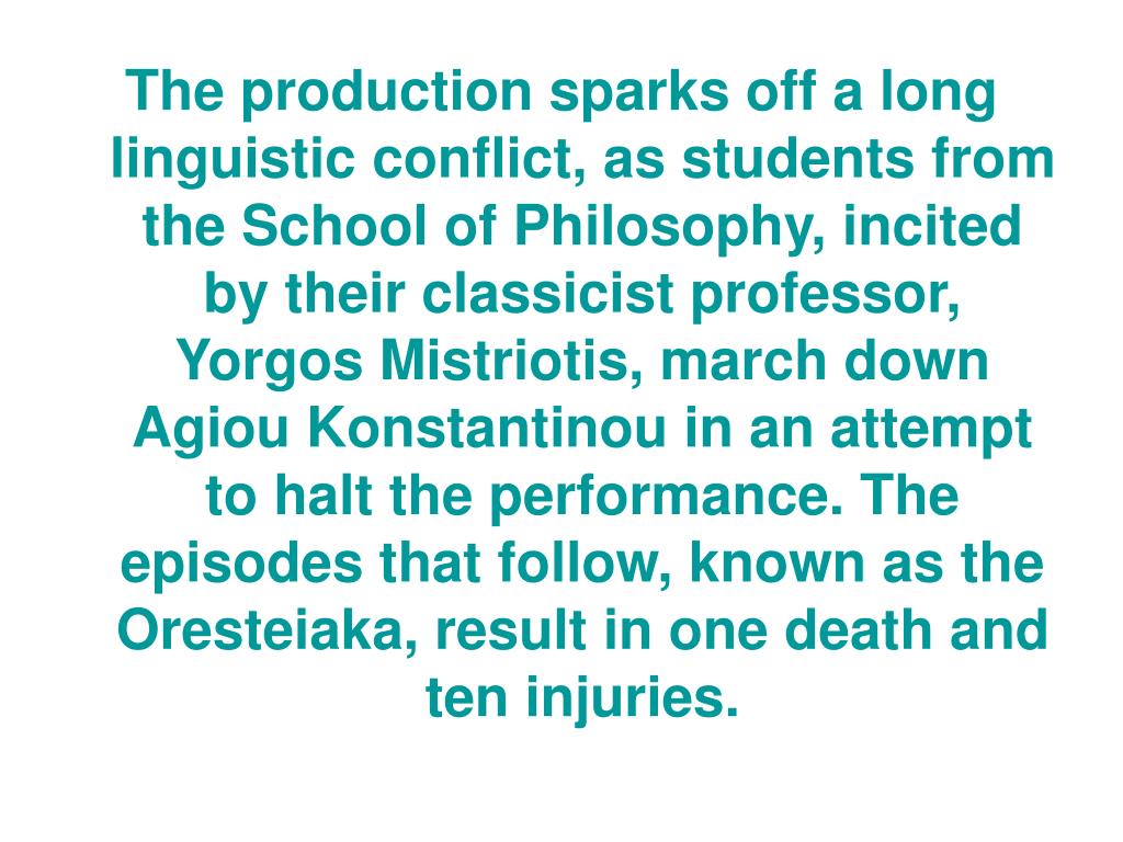 The production sparks off a long linguistic conflict, as students from the School of Philosophy, incited by their classicist professor, Yorgos Mistriotis, march down Agiou Konstantinou in an attempt to halt the performance. The episodes that follow, known as the Oresteiaka, result in one death and ten injuries.