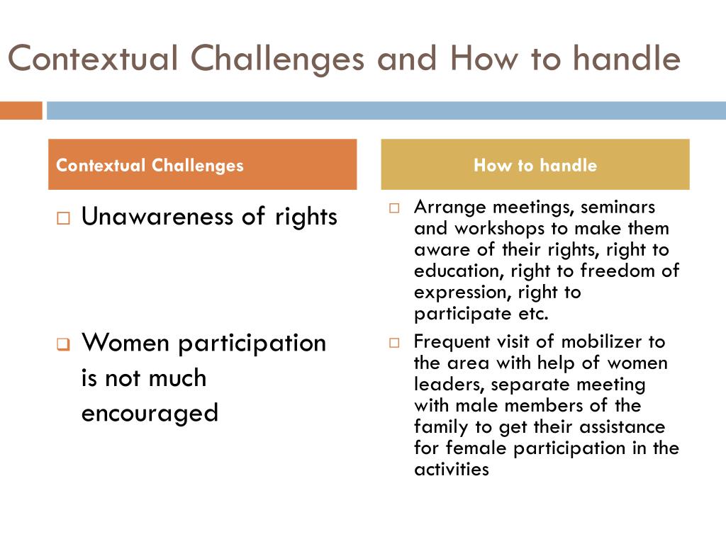 Contextual Challenges and How to handle Contextual Challenges How to handle • Unawareness of rights • Women participation is not much encouraged • Arrange meetings, seminars and workshops to make them aware of their rights, right to education, right to freedom of expression, right to participate etc. • Frequent visit of mobilizer to the area with help of women leaders, separate meeting with male members of the family to get their assistance for female participation in the activities