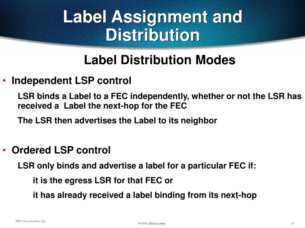 Label Assignment and Distribution • Labels have link-local significance • Each LSR binds his own label mappings • Each LSR assign labels to his FECs • Labels are assigned and exchanged between adjacent neighboring LSR • Applications may require non-adjacent neighbors