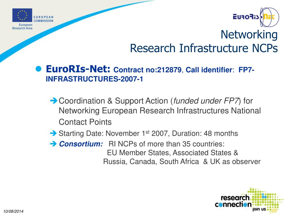 Networking Research Infrastructure NCPs • EuroRIs-Net: Contract no:212879, Call identifier: FP7-INFRASTRUCTURES-2007-1 • Coordination & Support Action (funded under FP7) for Networking European Research Infrastructures National Contact Points • Starting Date: November 1st 2007, Duration: 48 months • Consortium:RI NCPs of more than 35 countries: • EU Member States, Associated States & • Russia, Canada, South Africa & UK as observer