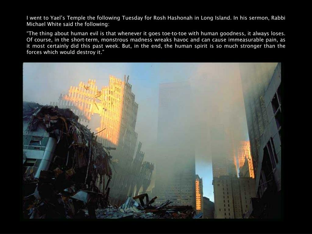 I went to Yael’s Temple the following Tuesday for Rosh Hashonah in Long Island. In his sermon, Rabbi Michael White said the following: “The thing about human evil is that whenever it goes toe-to-toe with human goodness, it always loses. Of course, in the short-term, monstrous madness wreaks havoc and can cause immeasurable pain, as it most certainly did this past week. But, in the end, the human spirit is so much stronger than the forces which would destroy it.”