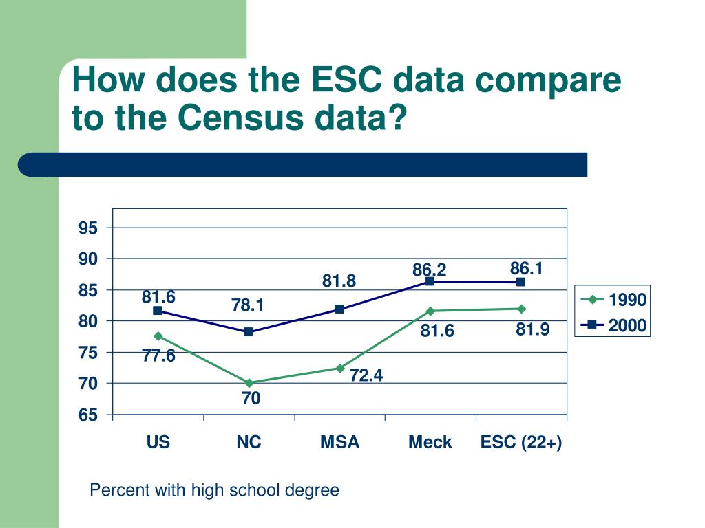 Data Elements Used in the Index • Pre-K, 3rd, 4th and 8th grade data from CMS and private schools • Graduation numbers from CMS and private schools • Adult (22+) data (highest grade completed) from the ESC (benchmarked against the 1990 and 2000 educational data from Census)