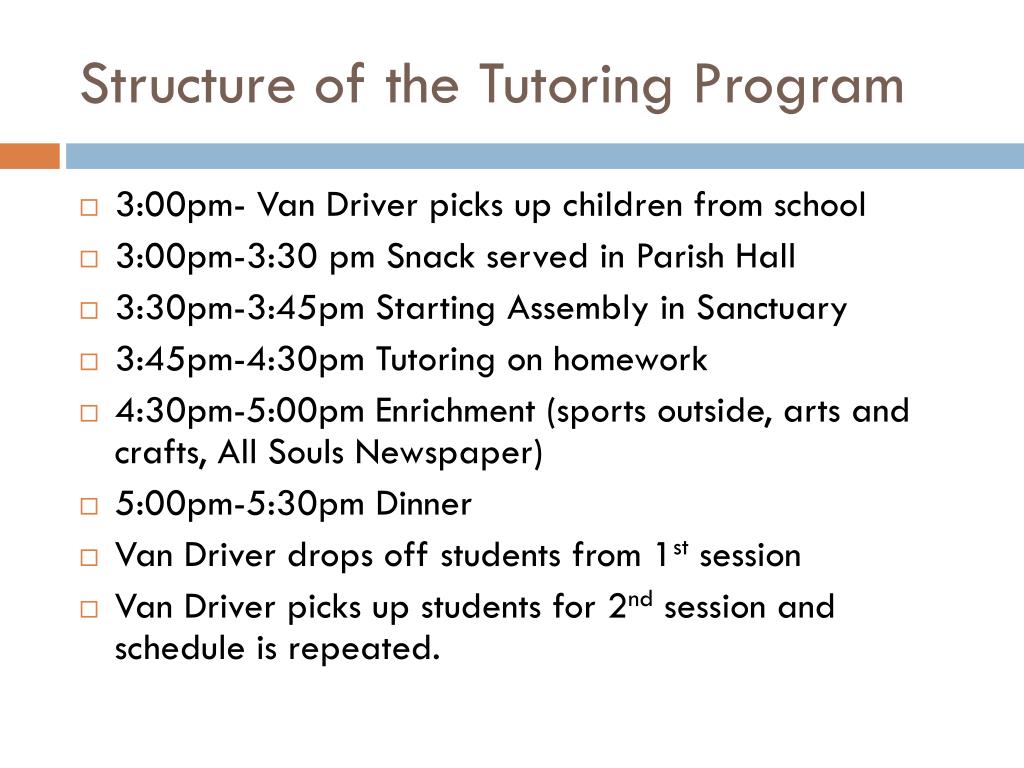 Structure of the Tutoring Program • 3:00pm- Van Driver picks up children from school • 3:00pm-3:30 pm Snack served in Parish Hall • 3:30pm-3:45pm Starting Assembly in Sanctuary • 3:45pm-4:30pm Tutoring on homework • 4:30pm-5:00pm Enrichment (sports outside, arts and crafts, All Souls Newspaper) • 5:00pm-5:30pm Dinner • Van Driver drops off students from 1stsession • Van Driver picks up students for 2nd session and schedule is repeated.