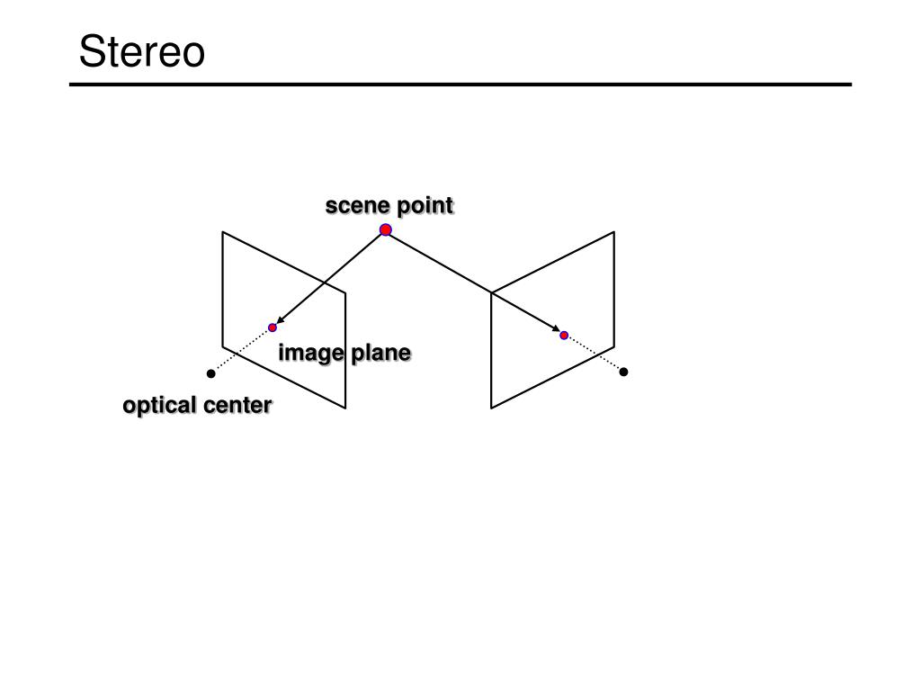 Stereo • Basic Principle: Triangulation • Gives reconstruction as intersection of two rays • Requires • camera pose (calibration) • point correspondence