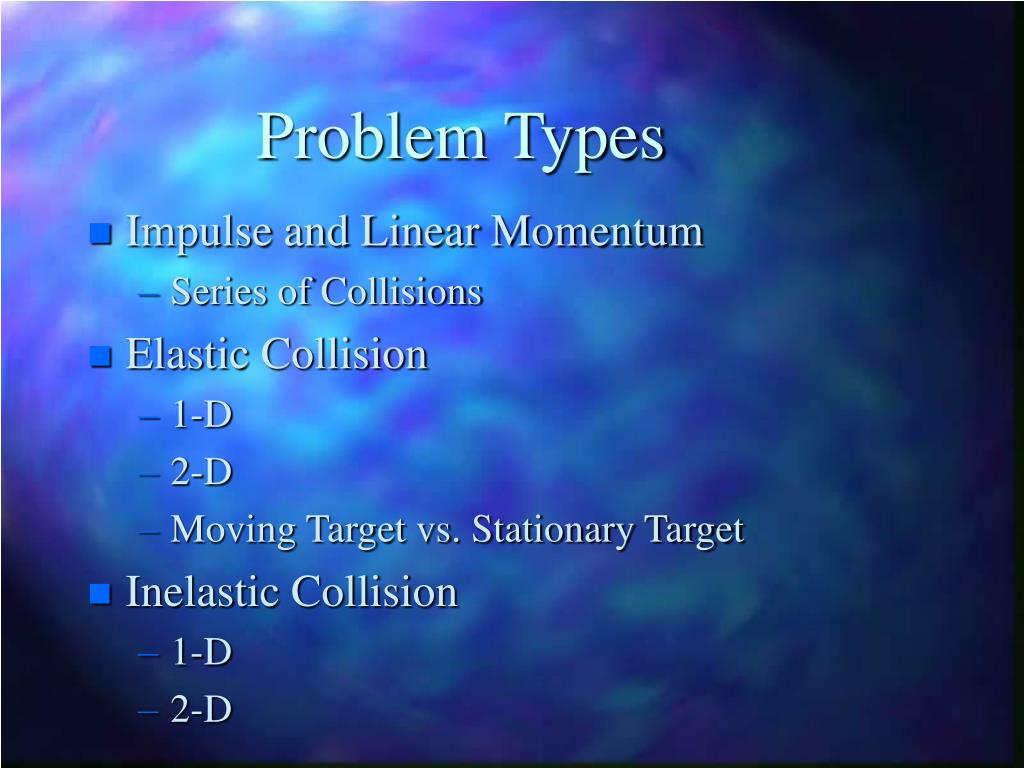 Problem Types • Impulse and Linear Momentum • Series of Collisions • Elastic Collision • 1-D • 2-D • Moving Target vs. Stationary Target • Inelastic Collision • 1-D • 2-D