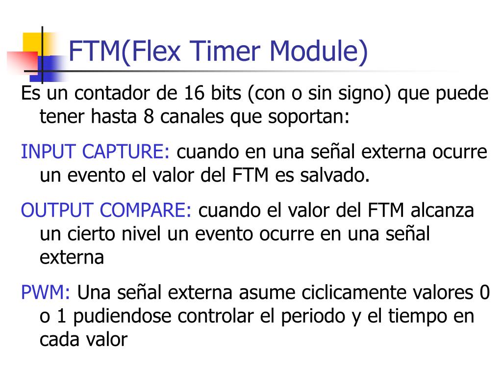 FTM(Flex Timer Module) Es un contador de 16 bits (con o sin signo) que puede tener hasta 8 canales que soportan: INPUT CAPTURE: cuando en una señal externa ocurre un evento el valor del FTM es salvado. OUTPUT COMPARE: cuando el valor del FTM alcanza un cierto nivel un evento ocurre en una señal externa PWM: Una señal externa asume ciclicamente valores 0 o 1 pudiendose controlar el periodo y el tiempo en cada valor