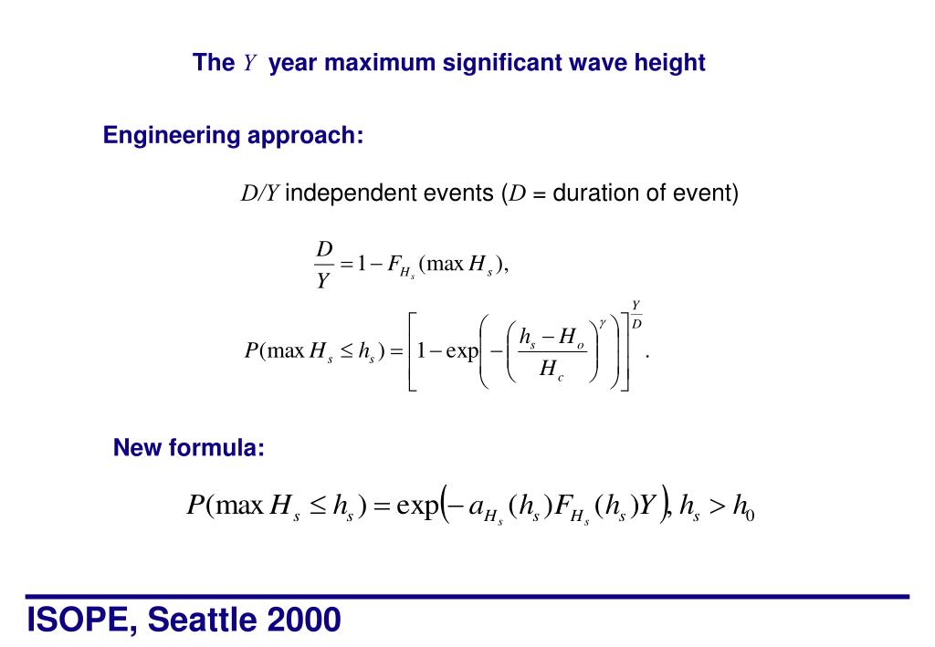 The Y year maximum significant wave height Engineering approach: D/Y independent events (D = duration of event) New formula:
