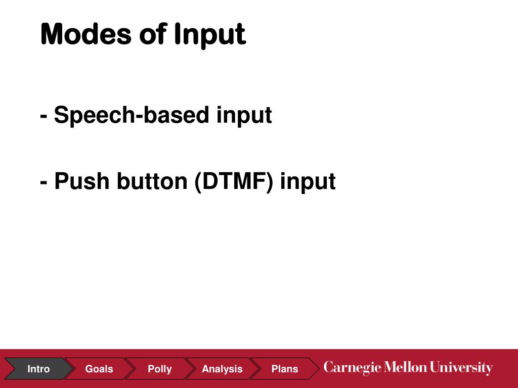 Modes of Input - Speech-based input - Push button (DTMF) input Intro Goals Polly Analysis Plans