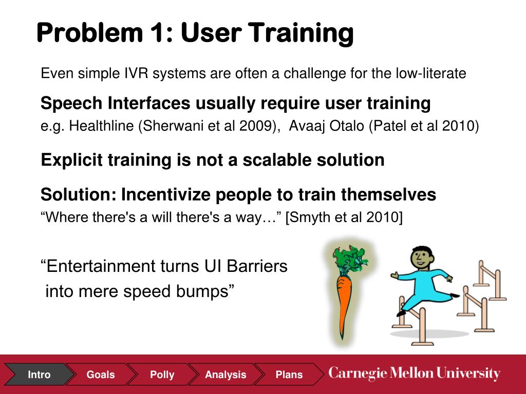 Problem 1: User Training Even simple IVR systems are often a challenge for the low-literate Speech Interfacesusually require user training e.g. Healthline(Sherwani et al 2009), AvaajOtalo (Patel et al 2010) Explicit training is not a scalable solution Solution: Incentivize people to train themselves “Where there's a will there's a way…” [Smyth et al 2010] “Entertainment turns UI Barriers into mere speed bumps” Intro Goals Polly Analysis Plans
