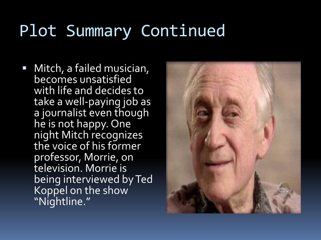 Plot Summary Continued • Mitch, a failed musician, becomes unsatisfied with life and decides to take a well-paying job as a journalist even though he is not happy. One night Mitch recognizes the voice of his former professor, Morrie, on television. Morrie is being interviewed by Ted Koppel on the show “Nightline.”