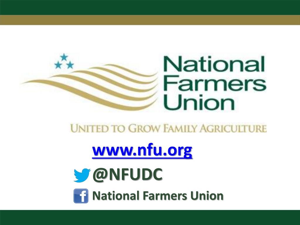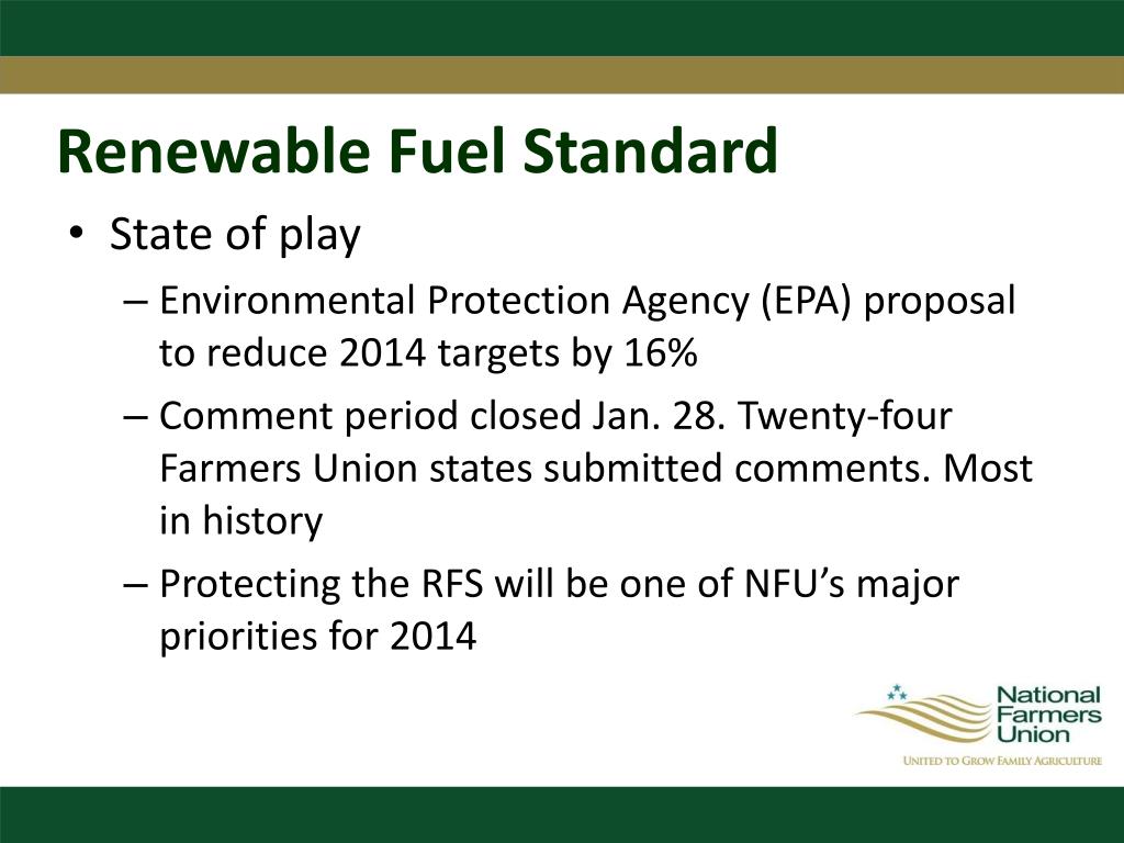 Renewable Fuel Standard • State of play • Environmental Protection Agency (EPA) proposal to reduce 2014 targets by 16% • Comment period closed Jan. 28. Twenty-four Farmers Union states submitted comments. Most in history • Protecting the RFS will be one of NFU’s major priorities for 2014