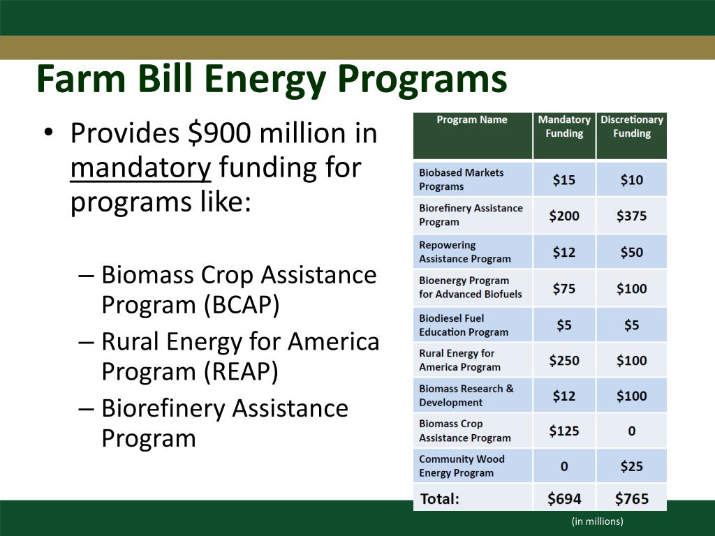 Farm Bill Energy Programs • Provides $900 million in mandatory funding for programs like: • Biomass Crop Assistance Program (BCAP) • Rural Energy for America Program (REAP) • Biorefinery Assistance Program (in millions)