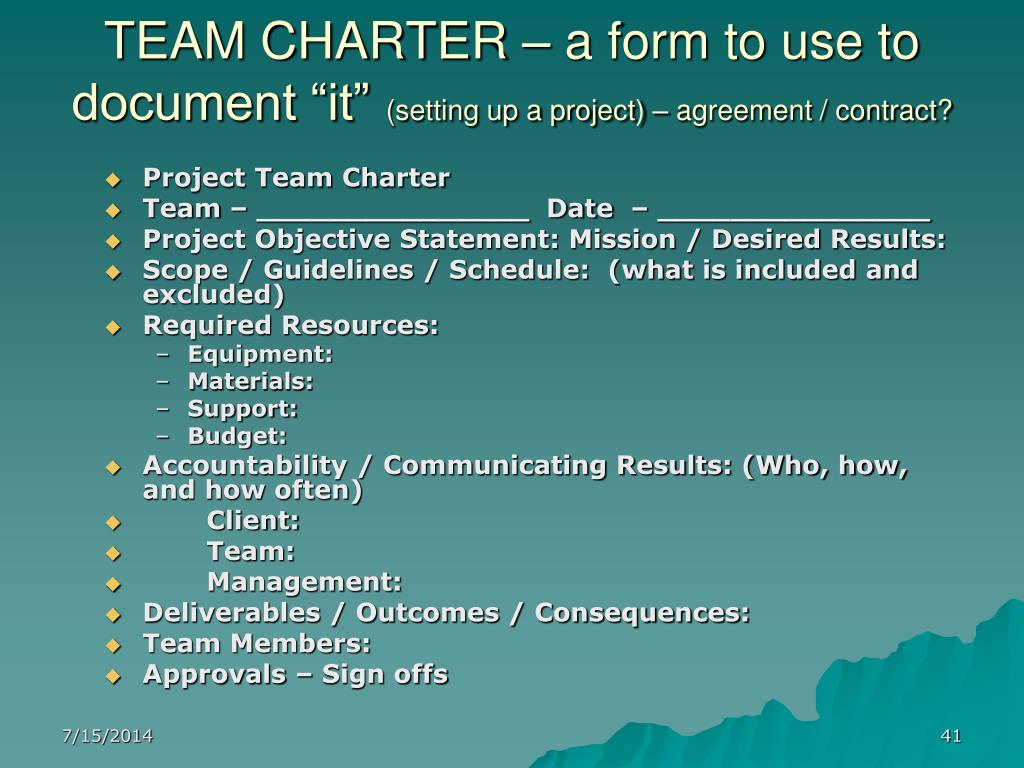 TEAM CHARTER – a form to use to document “it” (setting up a project) – agreement / contract? • Project Team Charter • Team – _______________ Date – _______________ • Project Objective Statement: Mission / Desired Results: • Scope / Guidelines / Schedule: (what is included and excluded) • Required Resources: • Equipment: • Materials: • Support: • Budget: • Accountability / Communicating Results: (Who, how, and how often) • Client: • Team: • Management: • Deliverables / Outcomes / Consequences: • Team Members: • Approvals – Sign offs