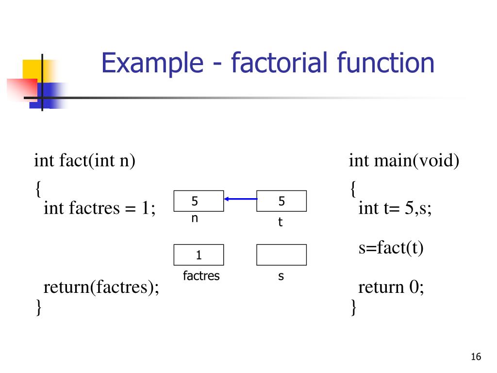 Example - factorial function int fact(int n) { int factres = 1; return(factres); } int main(void) { int t= 5,s; s=fact(t) return 0; } 5 5 n t 1 factres s