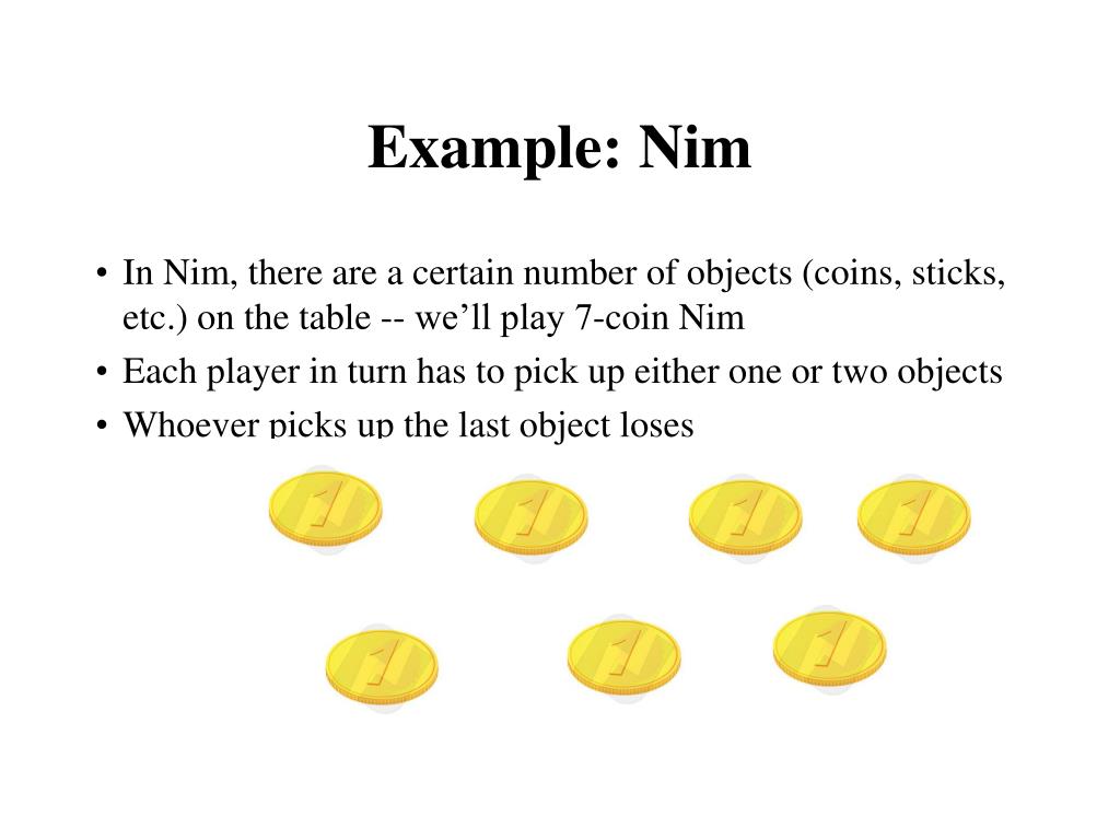 Example: Nim • In Nim, there are a certain number of objects (coins, sticks, etc.) on the table -- we’ll play 7-coin Nim • Each player in turn has to pick up either one or two objects • Whoever picks up the last object loses