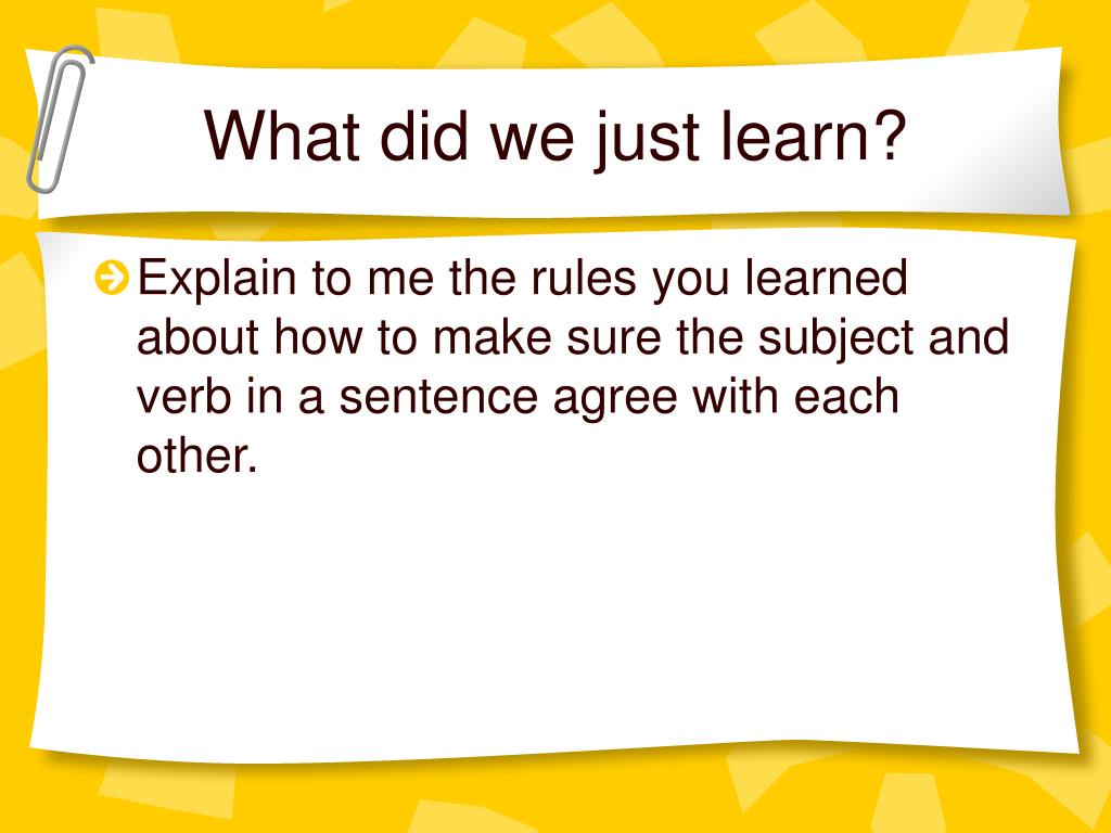 What did we just learn? • Explain to me the rules you learned about how to make sure the subject and verb in a sentence agree with each other.