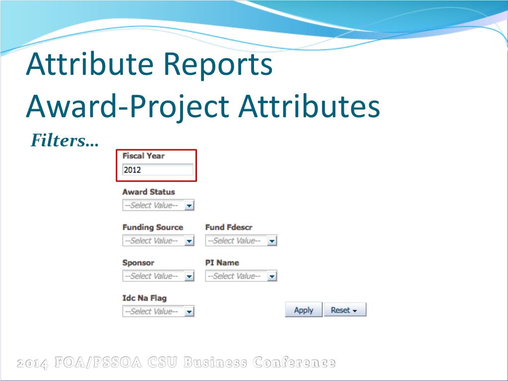 Attribute ReportsAward-Project Attributes • Intended to be a data dump of all of the attributes entered in the SP Mod, Award Entry • Contains no financial (GL) data • Often used to merge attributes with other reports downloaded to Excel • Runs two reports – the 2nd report (scroll down, keep scrolling) is a Project close-out report