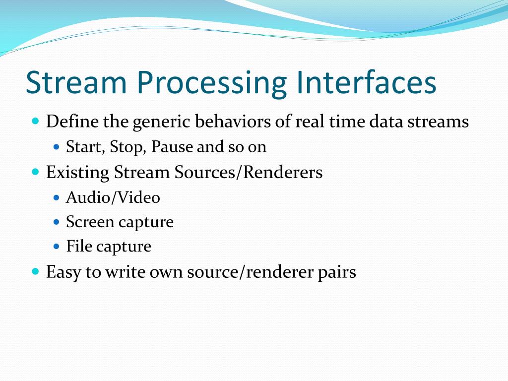 Stream Processing Interfaces • Define the generic behaviors of real time data streams • Start, Stop, Pause and so on • Existing Stream Sources/Renderers • Audio/Video • Screen capture • File capture • Easy to write own source/renderer pairs