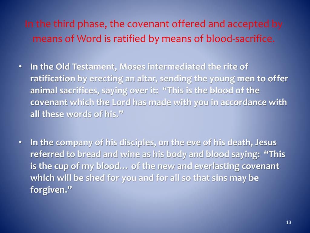 In the third phase, the covenant offered and accepted by means of Word is ratified by means of blood-sacrifice. • In the Old Testament, Moses intermediated the rite of ratification by erecting an altar, sending the young men to offer animal sacrifices, saying over it: “This is the blood of the covenant which the Lord has made with you in accordance with all these words of his.” • In the company of his disciples, on the eve of his death, Jesus referred to bread and wine as his body and blood saying: “This is the cup of my blood… of the new and everlasting covenant which will be shed for you and for all so that sins may be forgiven.”