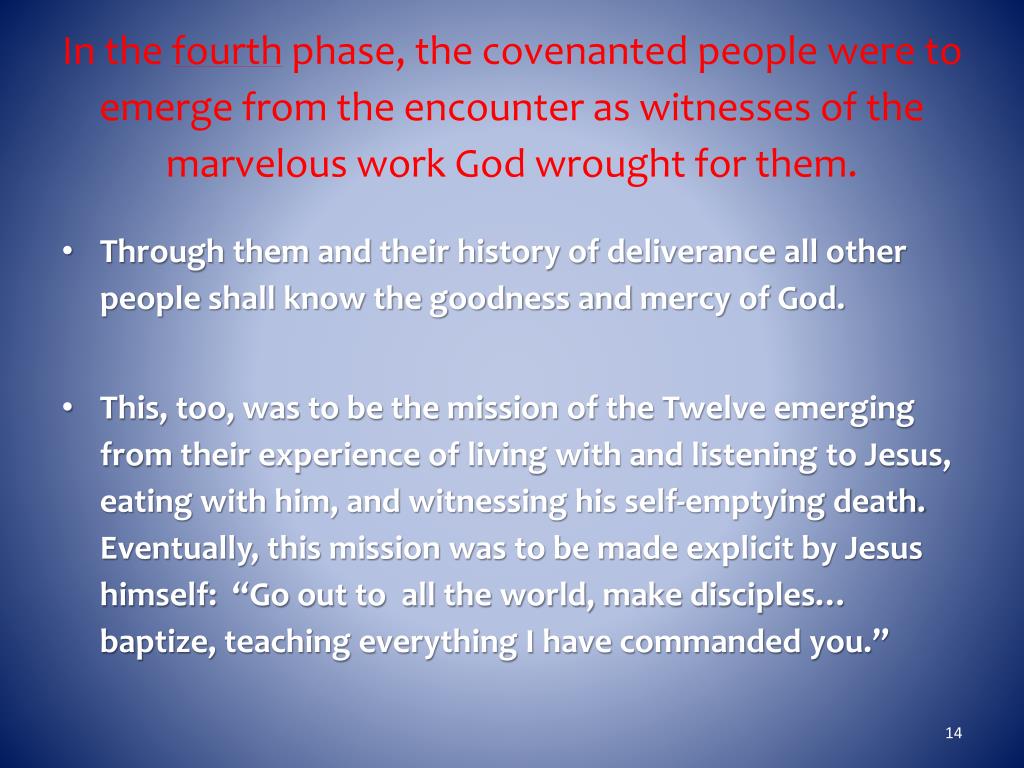 In the fourth phase, the covenanted people were to emerge from the encounter as witnesses of the marvelous work God wrought for them. • Through them and their history of deliverance all other people shall know the goodness and mercy of God. • This, too, was to be the mission of the Twelve emerging from their experience of living with and listening to Jesus, eating with him, and witnessing his self-emptying death. Eventually, this mission was to be made explicit by Jesus himself: “Go out to all the world, make disciples… baptize, teaching everything I have commanded you.”