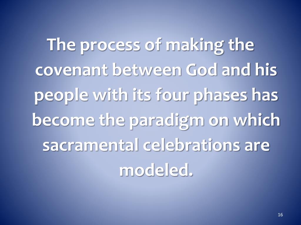 The process of making the covenant between God and his people with its four phases has become the paradigm on which sacramental celebrations are modeled.