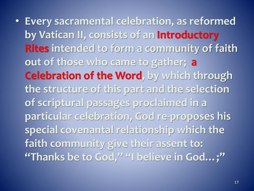 Every sacramental celebration, as reformed by Vatican II, consists of an Introductory Rites intended to form a community of faith out of those who came to gather; a Celebration of the Word, by which through the structure of this part and the selection of scriptural passages proclaimed in a particular celebration, God re-proposes his special covenantal relationship which the faith community give their assent to: “Thanks be to God,” “I believe in God…;”