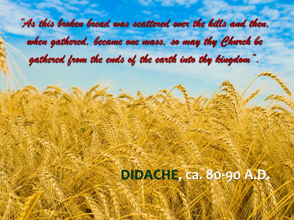 “As this broken bread was scattered over the hills and then, when gathered, became one mass, so may thy Church be gathered from the ends of the earth into thy kingdom”. DIDACHE, ca. 80-90 A.D.