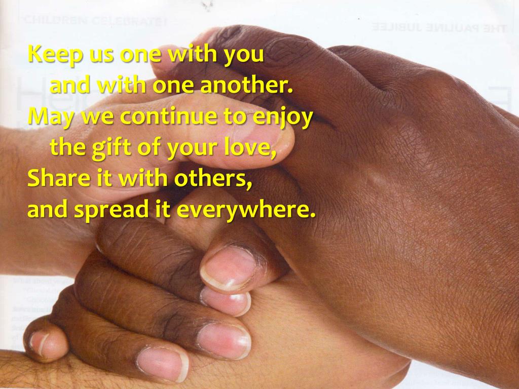 Keep us one with you and with one another. May we continue to enjoy the gift of your love, Share it with others, and spread it everywhere.