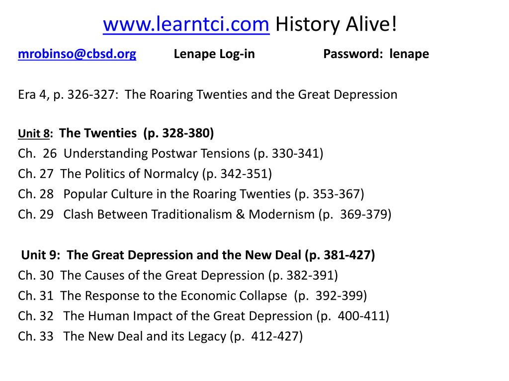 www.learntci.com History Alive! mrobinso@cbsd.orgLenape Log-in Password: lenape Era 4, p. 326-327: The Roaring Twenties and the Great Depression Unit 8: The Twenties (p. 328-380) Ch. 26 Understanding Postwar Tensions (p. 330-341) Ch. 27 The Politics of Normalcy (p. 342-351) Ch. 28 Popular Culture in the Roaring Twenties (p. 353-367) Ch. 29 Clash Between Traditionalism & Modernism (p. 369-379) Unit 9: The Great Depression and the New Deal (p. 381-427) Ch. 30 The Causes of the Great Depression(p. 382-391) Ch. 31 The Response to the Economic Collapse (p. 392-399) Ch. 32 The Human Impact of the Great Depression (p. 400-411) Ch. 33 The New Deal and its Legacy (p. 412-427)