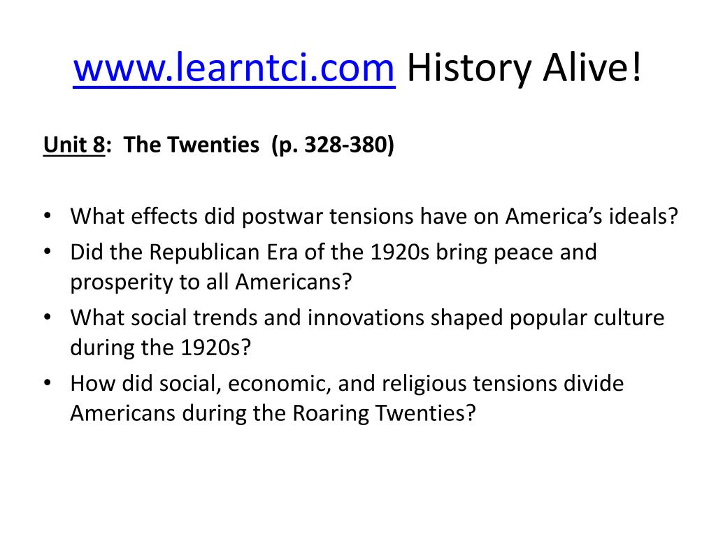 www.learntci.com History Alive! Unit 8: The Twenties (p. 328-380) • What effects did postwar tensions have on America’s ideals? • Did the Republican Era of the 1920s bring peace and prosperity to all Americans? • What social trends and innovations shaped popular culture during the 1920s? • How did social, economic, and religious tensions divide Americans during the Roaring Twenties?