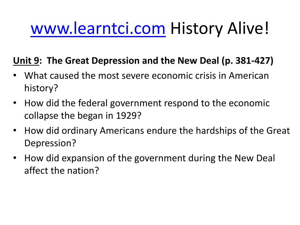 www.learntci.com History Alive! Unit 9: The Great Depression and the New Deal (p. 381-427) • What caused the most severe economic crisis in American history? • How did the federal government respond to the economic collapse the began in 1929? • How did ordinary Americans endure the hardships of the Great Depression? • How did expansion of the government during the New Deal affect the nation?