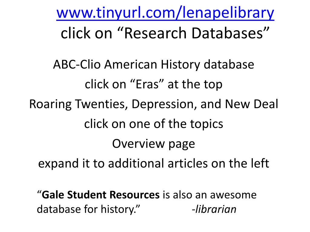 www.tinyurl.com/lenapelibraryclick on “Research Databases” ABC-Clio American History database click on “Eras” at the top Roaring Twenties, Depression, and New Deal click on one of the topics Overview page expand it to additional articles on the left “Gale Student Resources is also an awesome database for history.” -librarian