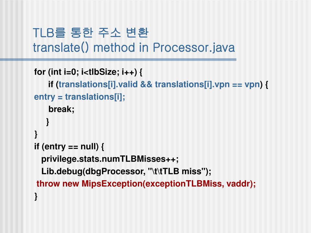 TLB를 통한 주소 변환translate() method in Processor.java for (int i=0; i<tlbSize; i++) { if (translations[i].valid && translations[i].vpn == vpn) { entry = translations[i]; break; } } if (entry == null) { privilege.stats.numTLBMisses++; Lib.debug(dbgProcessor, "\t\tTLB miss"); throw new MipsException(exceptionTLBMiss, vaddr); }