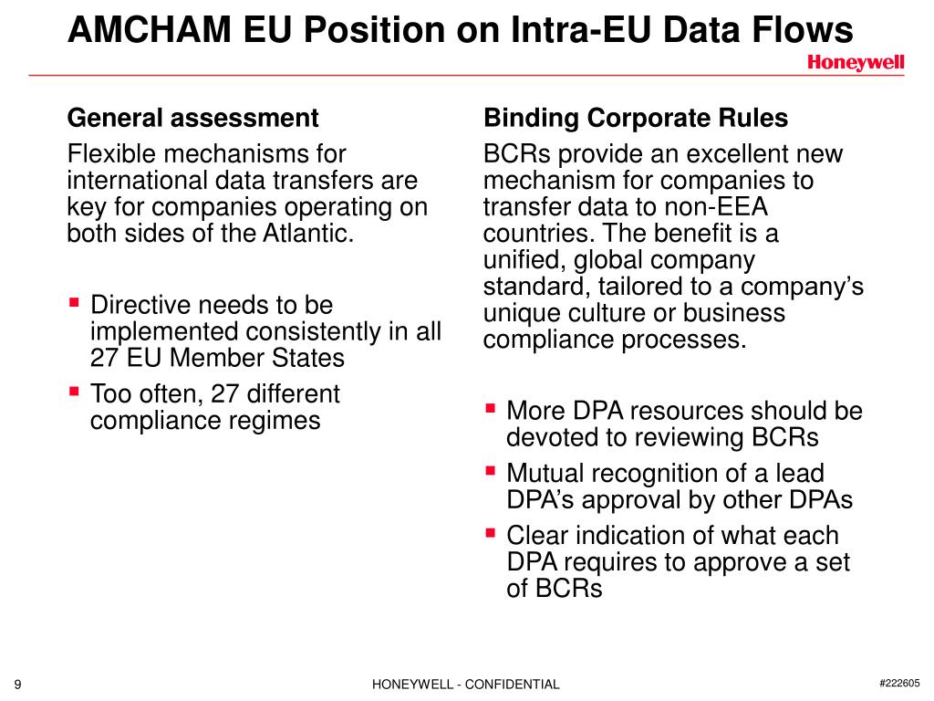 General assessment Flexible mechanisms for international data transfers are key for companies operating on both sides of the Atlantic. Directive needs to be implemented consistently in all 27 EU Member States Too often, 27 different compliance regimes Binding Corporate Rules BCRs provide an excellent new mechanism for companies to transfer data to non-EEA countries. The benefit is a unified, global company standard, tailored to a company’s unique culture or business compliance processes. More DPA resources should be devoted to reviewing BCRs Mutual recognition of a lead DPA’s approval by other DPAs Clear indication of what each DPA requires to approve a set of BCRs AMCHAM EU Position on Intra-EU Data Flows