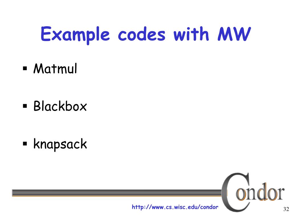 MWDriver (the master) • get_userinfo(int argc, char **argv) • RMC->add_executable(char *exe, char *requirements); • setup_initial_tasks(int num_tasks, MWTask ***init_tasks) • act_on_completed_task(MWTask *t) • RMC->add_task(MWTask *t) • Also constructor and destructor