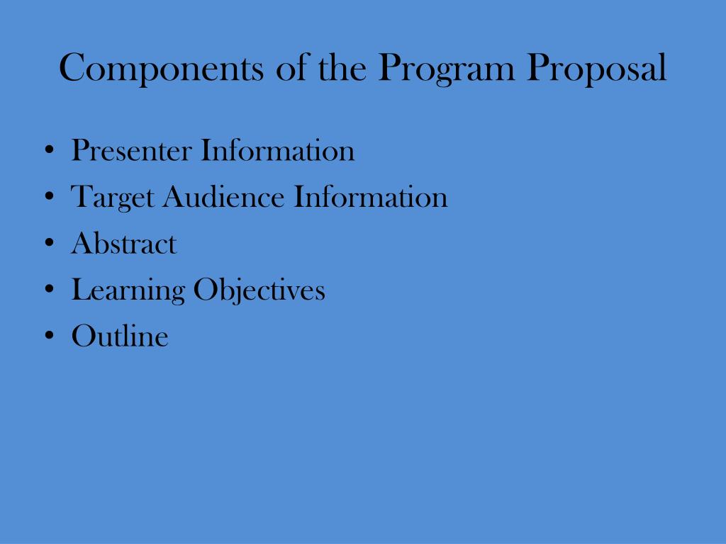 Components of the Program Proposal • Presenter Information • Target Audience Information • Abstract • Learning Objectives • Outline