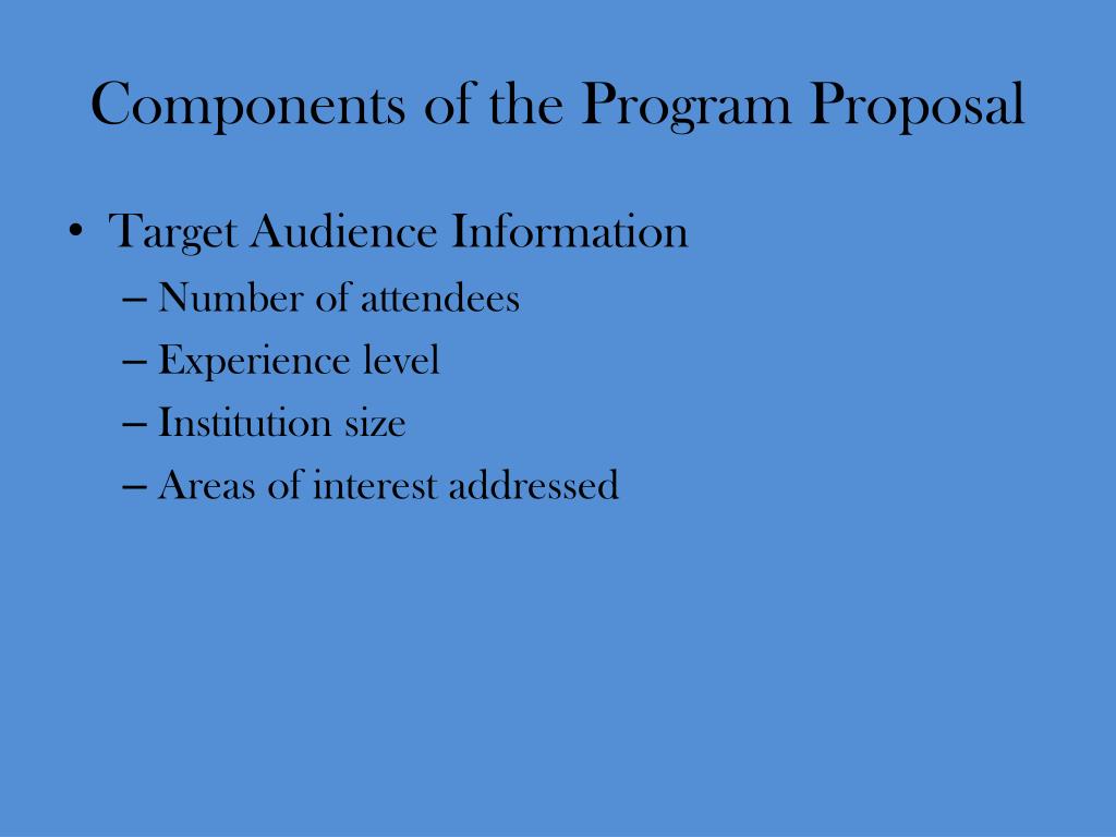 Components of the Program Proposal • Target Audience Information • Number of attendees • Experience level • Institution size • Areas of interest addressed