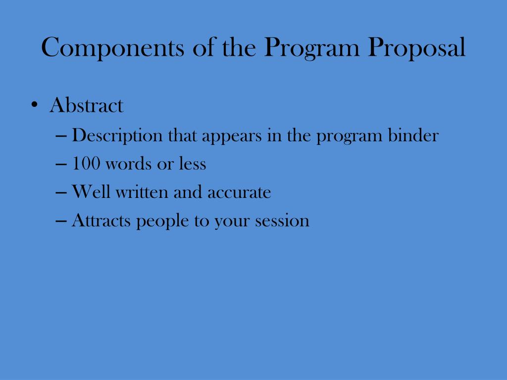 Components of the Program Proposal • Abstract • Description that appears in the program binder • 100 words or less • Well written and accurate • Attracts people to your session
