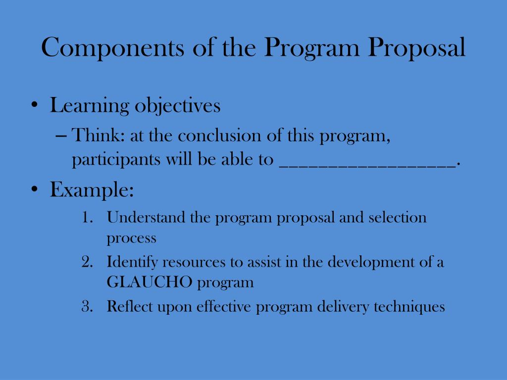 Components of the Program Proposal • Learning objectives • Think: at the conclusion of this program, participants will be able to __________________. • Example: • Understand the program proposal and selection process • Identify resources to assist in the development of a GLAUCHO program • Reflect upon effective program delivery techniques