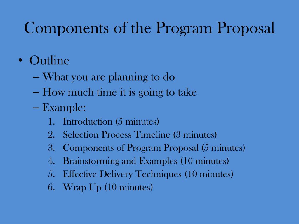Components of the Program Proposal • Outline • What you are planning to do • How much time it is going to take • Example: • Introduction (5 minutes) • Selection Process Timeline (3 minutes) • Components of Program Proposal (5 minutes) • Brainstorming and Examples (10 minutes) • Effective Delivery Techniques (10 minutes) • Wrap Up (10 minutes)