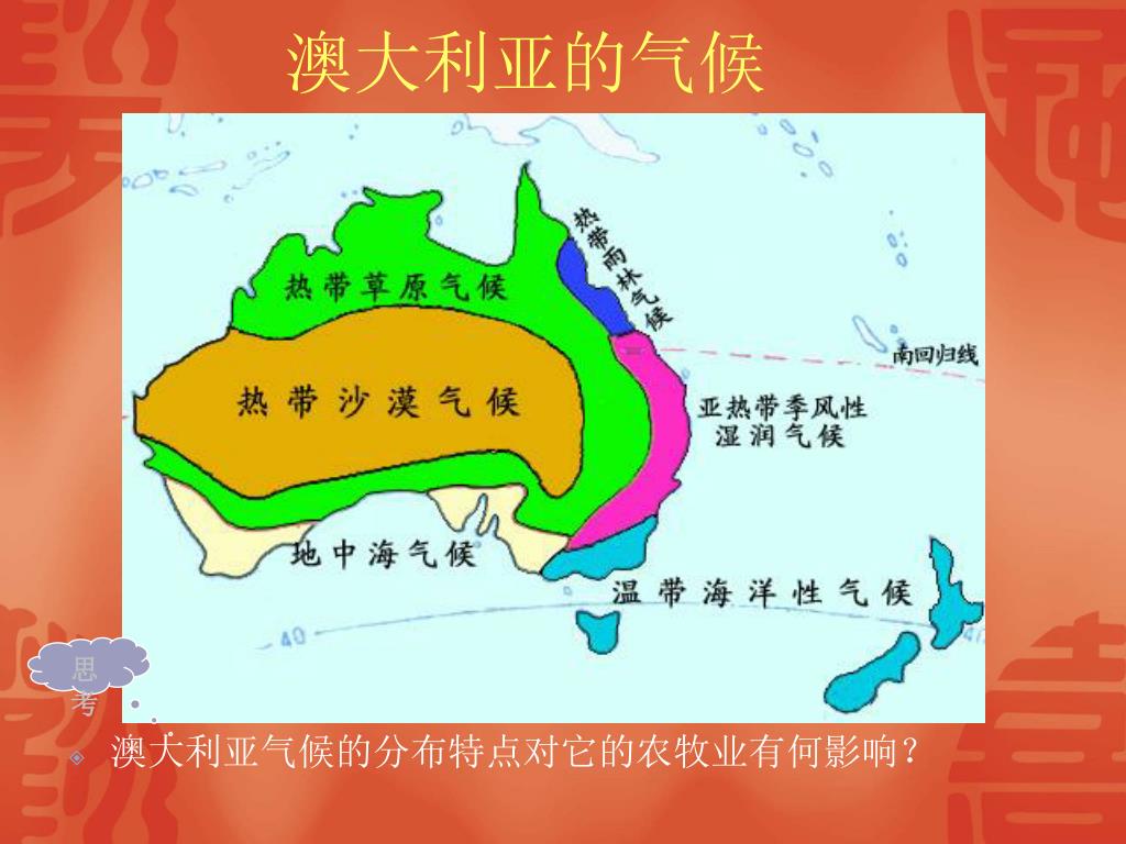 澳大利亚的气候 思 考 • 澳大利亚气候的分布特点对它的农牧业有何影响?