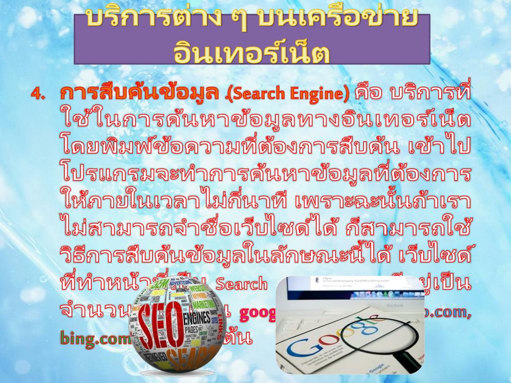 บริการต่าง ๆ บนเครือข่ายอินเทอร์เน็ต การสืบค้นข้อมูล (Search Engine) คือ บริการที่ใช้ในการค้นหาข้อมูลทางอินเทอร์เน็ต โดยพิมพ์ข้อความที่ต้องการสืบค้น เข้าไป โปรแกรมจะทำการค้นหาข้อมูลที่ต้องการ ให้ภายในเวลาไม่กี่นาที เพราะฉะนั้นถ้าเราไม่สามารถจำชื่อเว็บไซด์ได้ ก็สามารถใช้วิธีการสืบค้นข้อมูลในลักษณะนี้ได้ เว็บไซด์ที่ทำหน้าที่เป็น Search Engines มีอยู่เป็นจำนวนมาก เช่น google.com,yahoo.com,bing.com ฯลฯ เป็นต้น