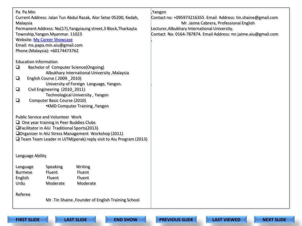 Pa Pa Min • Current Address: JalanTun Abdul Razak, AlorSetar 05200, Kedah, Malaysia • Permanent Address: No(17),Yangyiaung street,3 Block,TharkaytaTownship,Yangon.Myanmar. 11023 • Website: My Career Showcase • Email: ms.papa.min.aiu@gmail.com • Phone (Malaysia): +60174473762 • Education Information • Bachelor of Computer Science(Ongoing) • Albukhary International University ,Malaysia • English Course ( 2009 _2010) • University of Foreign Language, Yangon. • Civil Engineering (2010_2011) • Technological University , Yangon • Computer Basic Course (2010) • KMD Computer Training ,Yangon • Public Service and Volunteer Work • One year training in Peer Buddies Clubs • Facilitator in AiU Traditional Sports(2013) • Organizer in AiU Stress Management Workshop (2011) • Team Team Leader in UiTM(perak) reply visit to Aiu Program (2013) • Language Ability • Language Speaking Writing • Burmese Fluent Fluent • English Fluent Fluent • Urdu Moderate Moderate • Referee • Mr .Tin Shaine ,Founder of English Training School ,Yangon • Contact no: +095973216355 .Email Address: tin.shaine@gmail.com • Mr .Jaime Cabrera, Professional English Lecturer,Albukhary International University. • Contact No: 0164-787874. Email Address: mr.jaime.aiu@gmail.com • , • . FIRST SLIDE LAST SLIDE END SHOW PREVIOUS SLIDE LAST VIEWED NEXT SLIDE