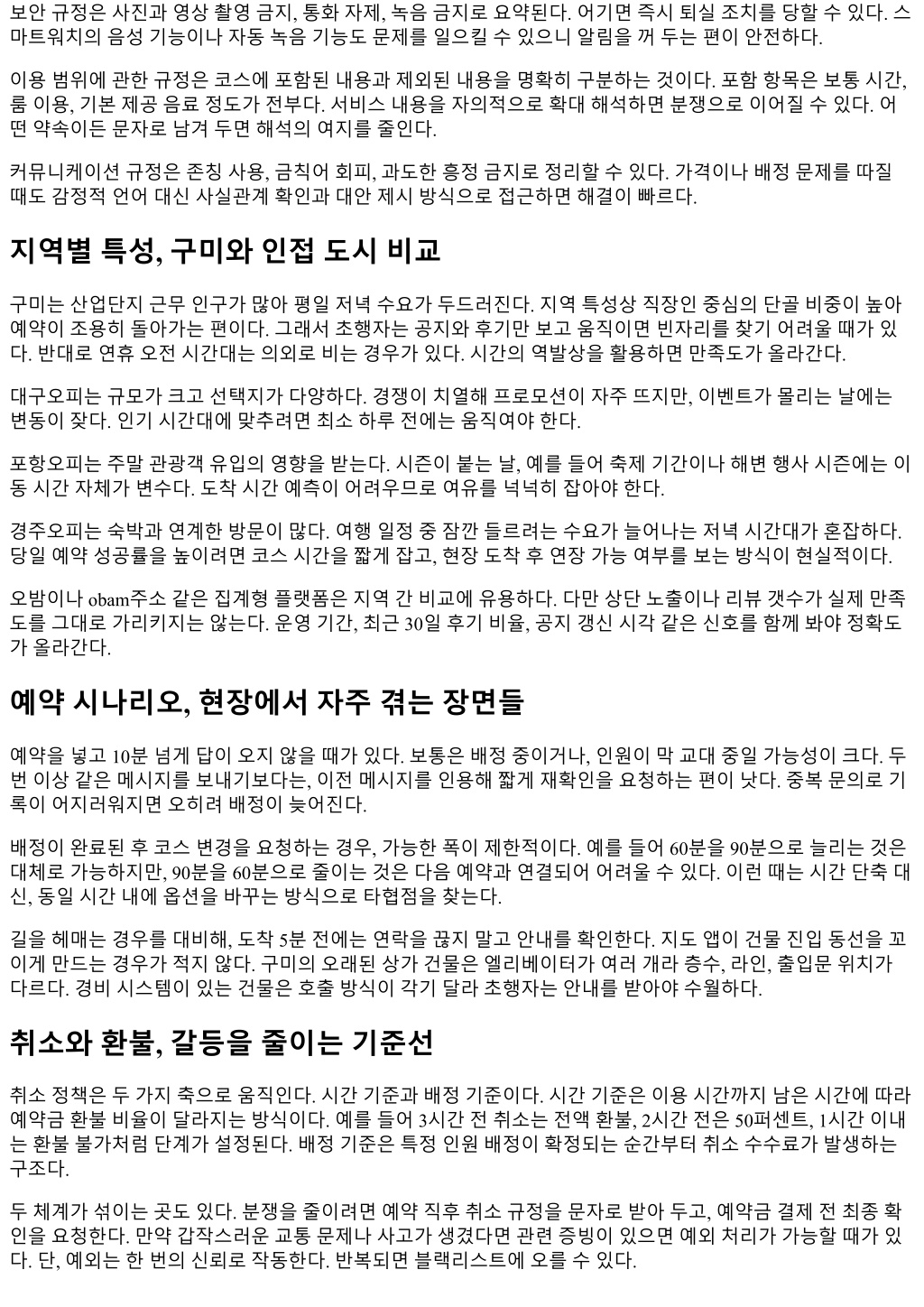 커뮤니케이션의디테일, 말투가결과를바꾼다 현장에서가장흔하게실패하는장면은말투가앞선다는점이다. 빠르게해결하려고압박을걸면오히려마찰이 생긴다. 구체적으로, 요구사항을짧게나누어전하는것이효과적이다. 첫문장에는사실, 둘째문장에는요청, 셋째문장에는대안순서가좋다. 예를들면다음과같이정리하면된다. 예약자이니셜 OO, 7시예약상태확인 부탁드립니다. 가능하다면 7시 10분으로조정원합니다. 어렵다면 7시그대로진행하겠습니다. 이런방식은담 당자가선택지를즉시판단하게만들어응답속도를높인다. 부정적이슈를제기할때도단정적표현보다는관찰을붙인다. 생각보다대기시간이길어지고있습니다, 가능 하면남은예상시간을알려주실수있을까요같은문장은협조를이끌어낸다. 비용과팁, 돈얘기를깔끔하게 구미오피의기본코스가격대는요일과시간대, 시설수준에따라넓게분포한다. 특정가격을단정하기보다는 구간으로이해하는편이정확하다. 평일낮시간대는상대적으로낮고, 피크시간대는높다. 카드결제수수료, 야간할증, 특정옵션추가비용등은사전에확인해야한다. 현금결제를선호하는곳이아직많기때문에, 잔돈문제를줄이려면 5천원, 만원권을적절히섞어준비한다. 모 바일이체의경우이체제한시간이나은행점검시간이걸릴수있어, 오후 11시이후에는지연이잦다. 이체가 늦어지면확인까지대기해야하고, 그사이코스시간이줄어드는불상사가생긴다. 팁문화는획일적이지않다. 필수는아니다. 다만응대가좋거나일정조정에무리가있었는데매끄럽게해결된 경우에는의사표시차원에서소액을건네는사람이많다. 금액이부담수준을넘지않게, 과한제스처를피하는 것이오히려깔끔하다. 안전과프라이버시, 기본을기본으로 안전은장소의문제이기도하지만, 이용자의태도에서출발한다. 첫방문이라면입구 CCTV나동선이복잡한지, 비상구위치가명확한지같은물리적요소를눈으로확인한다. 이왕이면엘리베이터앞이과도하게개방된곳보 다는출입동선이안정적인시설이좋다. 프라이버시는대기공간의밀집도, 문턱의높낮이, 방음상태에서도갈 린다. 소리가많이울리는구조라면문의로안내받아조용한룸배정을요청할수있다. 로그와기록을최소화하려면예약과결제에서남는흔적을관리한다. 메신저대화는필요한정보만남기고, 사 용뒤에는알림을정리한다. 현장에서신분증촬영을요구하는곳은거절하고대안을제시받는것이원칙이다. 이용당일체크포인트 아래체크리스트는당일에만적용하는간명한순서다. 예약앱보다사람손이빠를때가많다. 한번익혀두면크 게도움이된다. 도착 20분전: 위치재확인, 주차또는정류장하차지점점검, 연락채널열기도착 10분전: 현금또는결제 수단최종점검, 신분증지참확인, 휴대폰알림최소화도착시점: 안내문구그대로행동, 사진촬영금지 준수이용중: 코스진행속도나환경에불편이있으면즉시조용히요청, 장시간통화나녹음기능은금지 종료직후: 결제내역또는예약금정산확인, 다음예약가능시간대메모 재방문매너, 단골이신뢰를만든다 한곳과관계를쌓으면예약부터배정까지전체흐름이부드러워진다. 재방문시에는이전방문의만족요소하 나와개선바람한가지를짧게피드백으로남기면좋다. 과한칭찬보다구체적인포인트가신뢰를만든다. 예를 들어, 지난번 7시타임처럼조용한룸이면좋겠습니다같은문장이실제배정에유효하게작용한다.