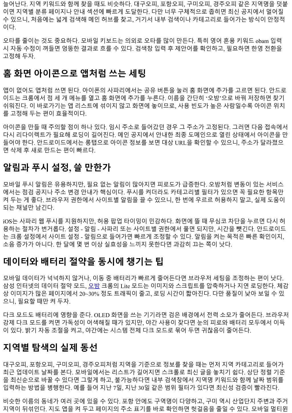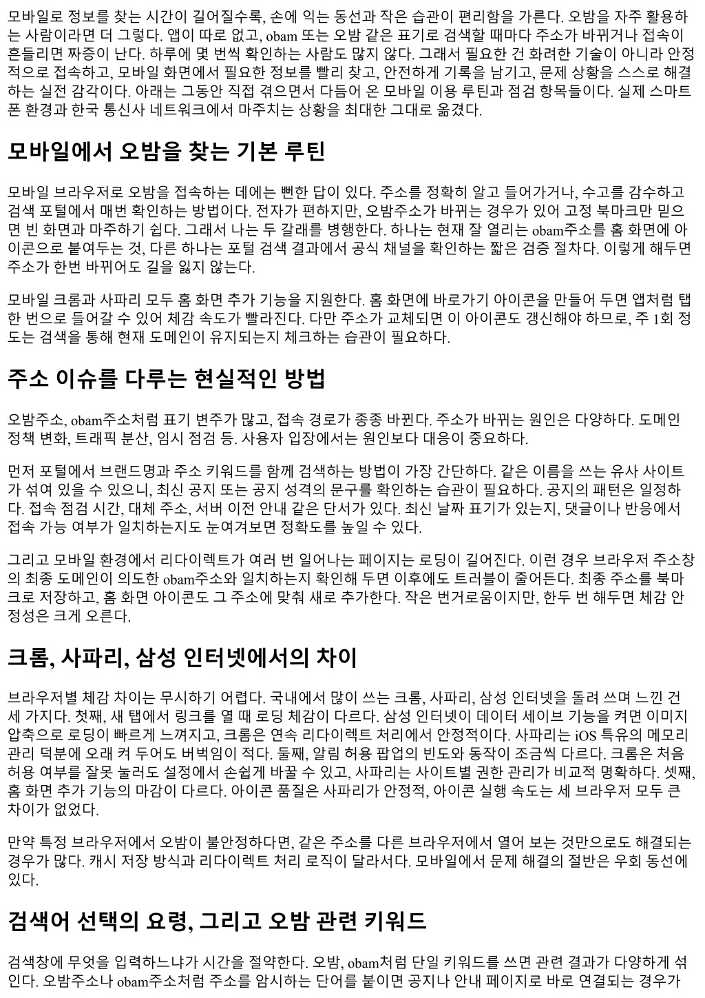 늘어난다. 지역키워드와함께찾을때도비슷하다. 대구오피, 포항오피, 구미오피, 경주오피같은지역명을덧붙 이면지역별분류페이지나안내섹션에빠르게도달한다. 다만너무구체적으로좁히면최신공지에서멀어질 수있으니, 처음에는넓게검색해메인허브를찾고, 거기서내부검색이나카테고리로들어가는방식이안정적 이다. 오타를줄이는것도중요하다. 모바일키보드는의외로오타를많이만든다. 특히영어혼용키워드 obam 입력 시자동수정이껴들면엉뚱한결과로흐를수있다. 검색창입력후제안어를확인하고, 필요하면한영전환을 고정해두자. 홈화면아이콘으로앱처럼쓰는세팅 앱이없어도앱처럼쓰면된다. 아이폰의사파리에서는공유버튼을눌러홈화면에추가를고르면된다. 안드로 이드는크롬에서점세개메뉴를열고홈화면에추가를누른다. 이름을간단히 ‘오밤’으로바꿔저장하면찾기 쉬워진다. 이바로가기는앱리스트에섞이지않고화면에놓이므로, 사용빈도가높은사람일수록아이콘위치 를고정해두는편이효율적이다. 아이콘을만들때주의할점이하나있다. 임시주소로들어갔던경우그주소가고정된다. 그러면다음접속에서 다시리다이렉트가필요해로딩이길어진다. 메인공지에서안내한최종도메인으로열린상태에서아이콘을만 들어야한다. 안드로이드에서는롱탭으로아이콘정보를보면대상 URL을확인할수있으니, 주소가달라졌으 면삭제후새로만드는편이빠르다. 알림과푸시설정, 쓸만한가 모바일푸시알림은유용하지만, 필요없는알림이많아지면피로도가급증한다. 오밤처럼변동이있는서비스 에서는점검공지나주소변경안내가핵심이다. 푸시를켜더라도카테고리별필터가있으면꼭필요한항목만 켜두는게좋다. 브라우저권한에서사이트별알림을끌수있으니, 한번에우르르허용하지말고, 실제도움이 되는채널만남긴다. iOS는사파리웹푸시를지원하지만, 허용팝업타이밍이민감하다. 화면에뜰때무심코차단을누르면다시허 용하는절차가번거롭다. 설정 - 알림 - 사파리또는사이트별권한에서풀면되지만, 시간을뺏긴다. 안드로이드 는크롬설정에서사이트설정 - 알림으로들어가면빠르게조정할수있다. 알림을켜는목적은빠른확인이지, 소음증가가아니다. 한달에몇번이상실효성을느끼지못한다면과감히끄는쪽이낫다. 데이터와배터리절약을동시에챙기는팁 모바일데이터가넉넉하지않거나, 이동중배터리가빠르게줄어든다면브라우저세팅을조정하는편이낫다. 삼성인터넷의데이터절약모드, 오밤크롬의 Lite 모드는이미지와스크립트를압축하거나지연로딩한다. 체감 상이미지가많은페이지에서 20~30% 정도트래픽이줄고, 로딩시간이짧아진다. 다만품질이낮아보일수있 으니, 필요할때만켜두자. 다크모드도배터리에영향을준다. OLED 화면을쓰는기기라면검은배경에서전력소모가줄어든다. 브라우저 강제다크모드를켜면가독성이어색해질때가있지만, 야간사용이잦다면눈의피로와배터리모두에서이득 이있다. 밝기자동조절을켜고, 야간에는시스템전체다크모드로묶어두면귀찮음이줄어든다. 지역별탐색의실제동선 대구오피, 포항오피, 구미오피, 경주오피처럼지역을기준으로정보를찾을때는먼저지역카테고리로들어가 최근업데이트날짜를본다. 모바일에서는리스트가길어지면스크롤로최신글을놓치기쉽다. 상단정렬기준 을최신순으로바꿀수있다면그렇게하고, 불가능하다면내부검색창에서지역명키워드와함께날짜범위를 입력하는방법을병행한다. 예를들어지난 7일, 지난 30일같은범위필터가있다면최신성검증이빨라진다. 비슷한이름의동네가여러곳에있을수있다. 포항안에도구역명이다양하고, 구미역시산업단지주변과주거 지역이뒤섞인다. 지도앱을켜두고페이지의주소표기를바로확인하면헛걸음을줄일수있다. 모바일멀티윈